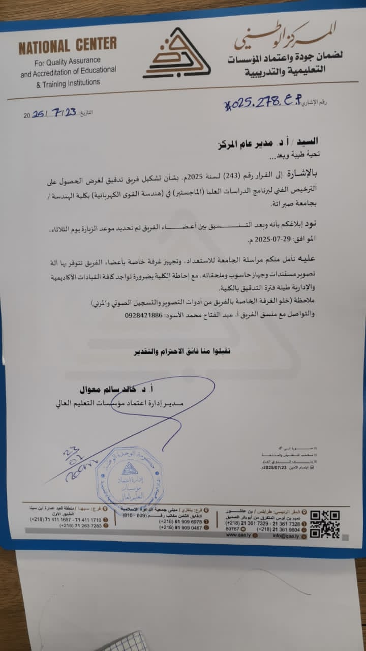 في إطار سعي جامعة صبراتة المستمر لتعزيز جودة برامجها الأكاديمية واستيفاء متطلبات الاعتماد الفني، استقبلت كلية الهندسة صباح اليوم فريق لجنة التدقيق المكلّف من المركز الوطني لضمان جودة واعتماد المؤسسات التعليمية والتدريبية، وذلك لغرض مراجعة مستندات الحصول على الترخيص الفني لبرنامج ماجستير هندسة القوى الكهربائية بقسم الهندسة الكهربائية والإلكترونية.